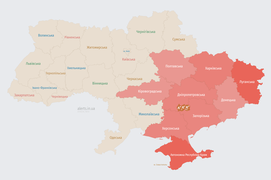 Воздушная тревога в Украине сейчас 23 февраля объявлена в ряде областей. В опасности Днепропетровская, Запорожская, Харьковская и другие. Угроза продолжается из-за атаки вражеских БпЛА.