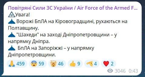 Скриншот сообщения из телеграмм-канала "Воздушные силы ВС Украины"