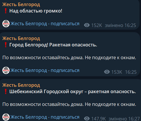 "У Бєлгороді та Бєлгородському районі запущено сирену ракетної небезпеки. Якщо ви перебуваєте вдома — не підходьте до вікон. Сховайтеся в приміщеннях без вікон із суцільними стінами (коридор, ванна, туалет, комора). Якщо ви перебуваєте на вулиці, спустіться в укриття або інше безпечне місце", — написав гауляйтер Бєлгородської області В'ячеслав Гладков у своєму Telegram-каналі.